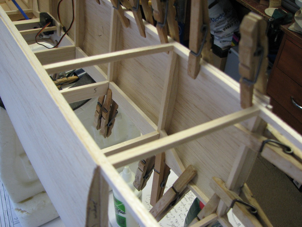 I had planned to do the wing seat before sheeting the fuselage. However, I became concerned that the highly flexible framework might distort during the sheeting process so I decided to get at least some of the sheeting done first.