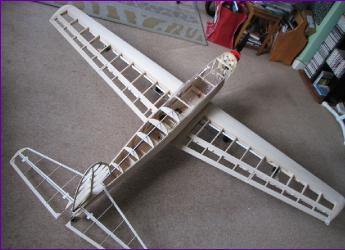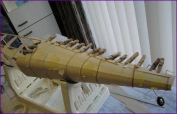 Stringers and formers give shape to the fuselage before 1/16in balsa skins are applied. I pre-formed some of the skins by rubber banding them in place and brushing them with water.