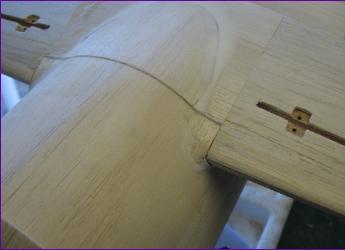 Next came the dreaded wing fairings. First, 1/164in ply baseplates were fitted, then the rear section of the fairing was fabricated from 1/16in balsa sheet over balsa formers. The forward section is very slim and was laminated from four strips of 1/16in balsa. Finally the front and rear ends of the fairing were blended into the fuselage using the well known 'make it up as you go along' method, topped out by a good smear of filler!
